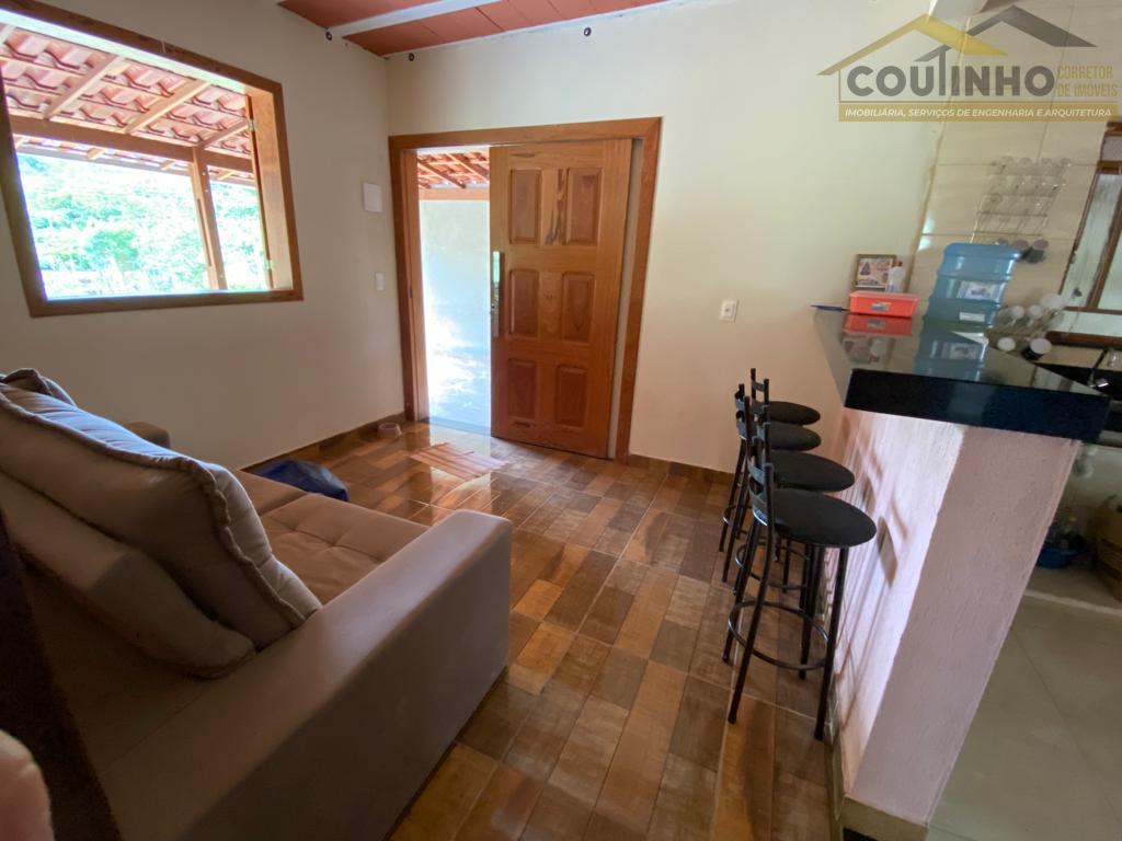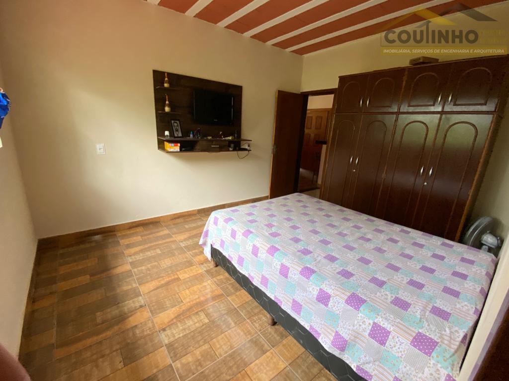 São 664,56 m² de terreno, com 10 m de frente. A casa apresenta cômodos grandes e bem divididos, são 2 quartos, sendo um suíte, sala conjungada com a cozinha e a divisória em bancada de mármore, banheiro social e área de serviço. Ao fundo da edificação vemos um pomar com árvores frutíferas. Varanda aconchegante e vaga de garagem para mais de um carro. Lugar muito tranquilo e ideal para se descansar. Água e energia na porta de casa.