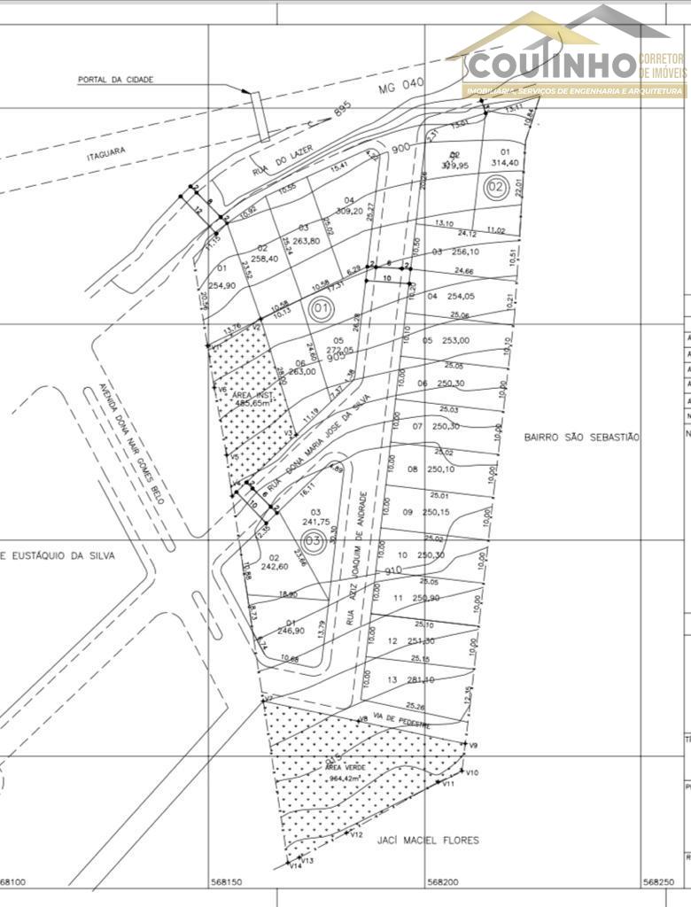 Imóvel localizado em perímetro urbano, na entrada de Crucilândia, quase em frente ao Parque de Exposição, situado ao lado do loteamento do Sérgio Coelho. Terreno com 9.800 m² e projeto para loteamento pronto, dividido em 21 lotes. Valor de investimento R$850.000,00.